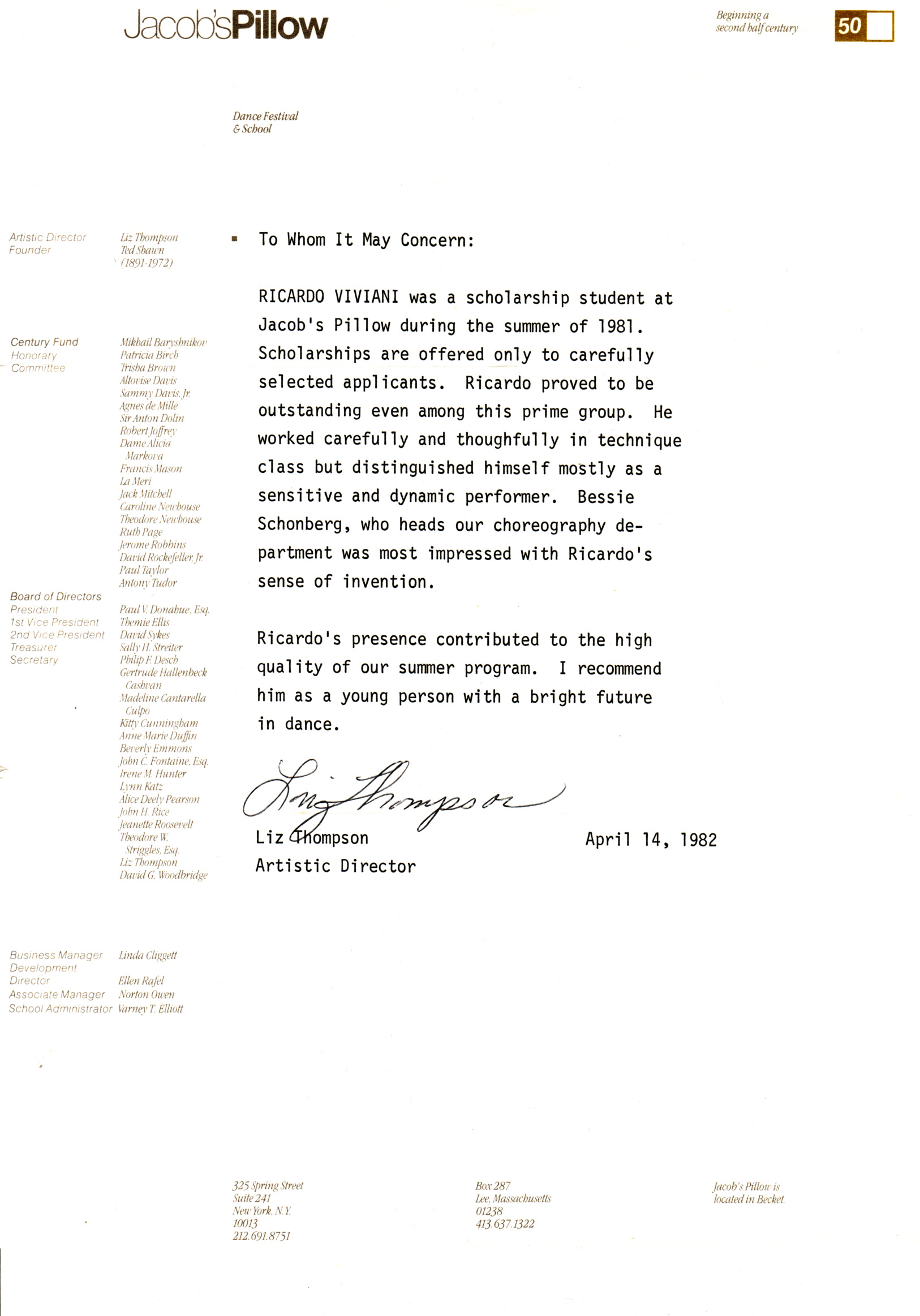 I am writing this letter to advise you that Ricardo Viviani is a valuable teacher to any performance program. He has taught for the State University of New York at New Paltz Study Abroad dance program in Prague and in Italy for many years.